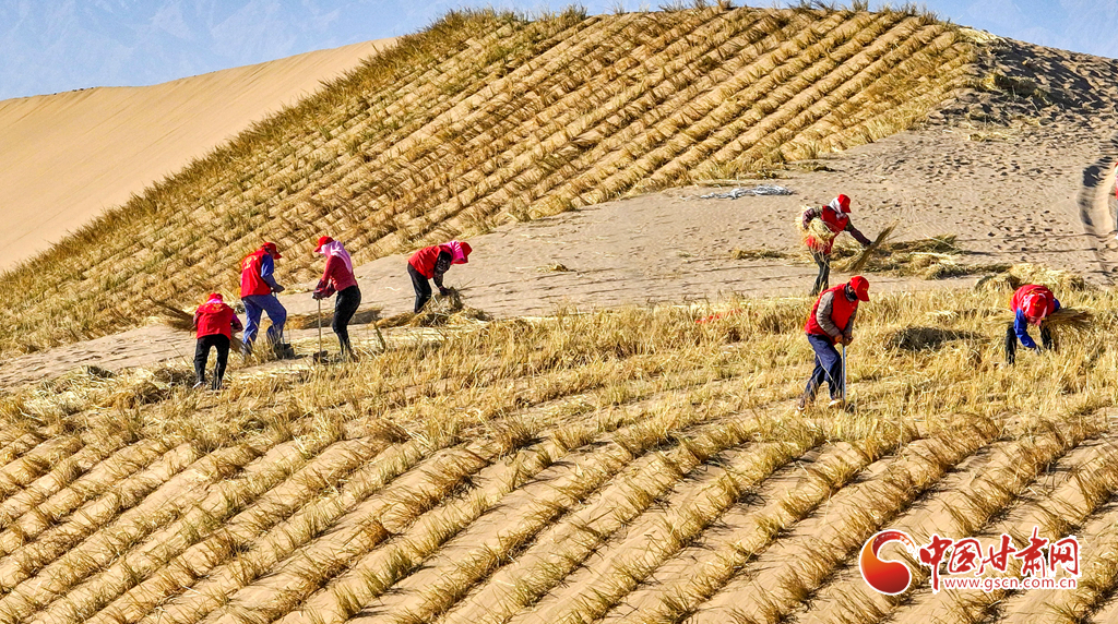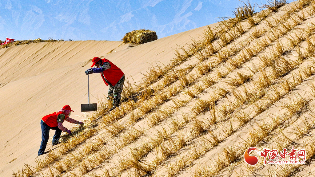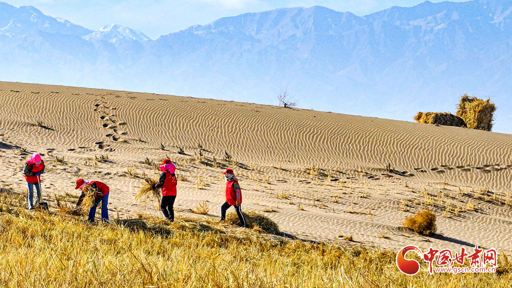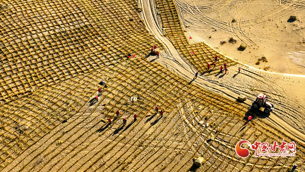 連日來,在張掖市肅南裕固族自治縣明花鄉(xiāng)西南部的干旱荒漠區(qū),運(yùn)草車輛往復(fù)穿梭,1600余名治沙工人于巴丹吉林沙漠西南緣的沙丘間忙碌作業(yè)。他們劃線、背草、俯身鋪草、揮鍬壓埋,全力營建沙障與固沙林帶,為沙漠牢牢“鎖邊”。