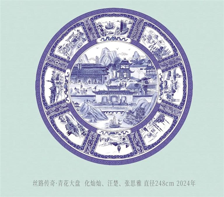 值得關(guān)注的是,展品中既有莫高窟第328窟復制彩塑這樣的經(jīng)典再現(xiàn),也有直徑達248厘米的“絲路傳奇·青花大盤”,呈現(xiàn)出多元文明共生的歷史圖景。瓷器作品是江西瓷藝大師歷時多年、多次赴敦煌采風創(chuàng)作的結(jié)晶,通過高溫顏色釉的窯變特性,將敦煌壁畫的斑駁肌理與礦物顏料的神秘色彩凝固定格,在釉色流淌間實現(xiàn)古典美學與現(xiàn)代工藝的完美融合。