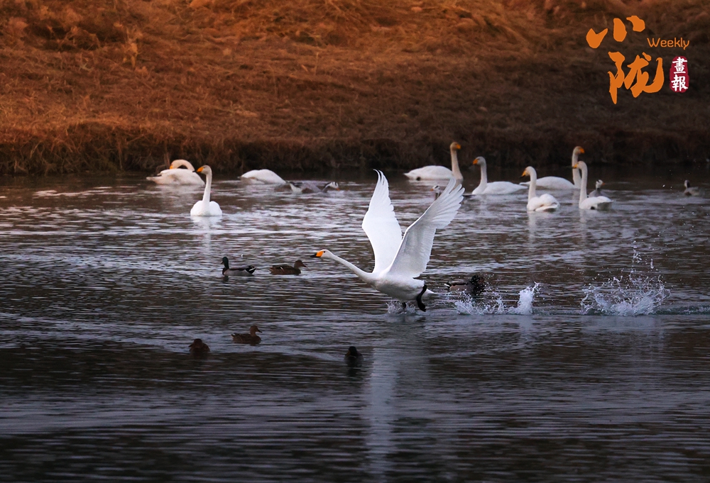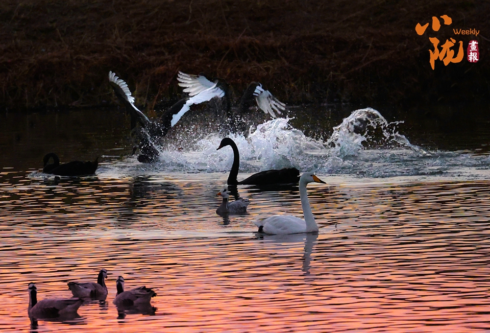 這里聚集了天鵝、赤麻鴨、灰雁等多種水鳥,它們在黃昏里愜意地游弋,或扎進(jìn)水里捕魚,或相互追逐戲水的畫面,既震撼又溫柔,成為攝影愛好者和游人爭相追逐的“冬日奇景”。