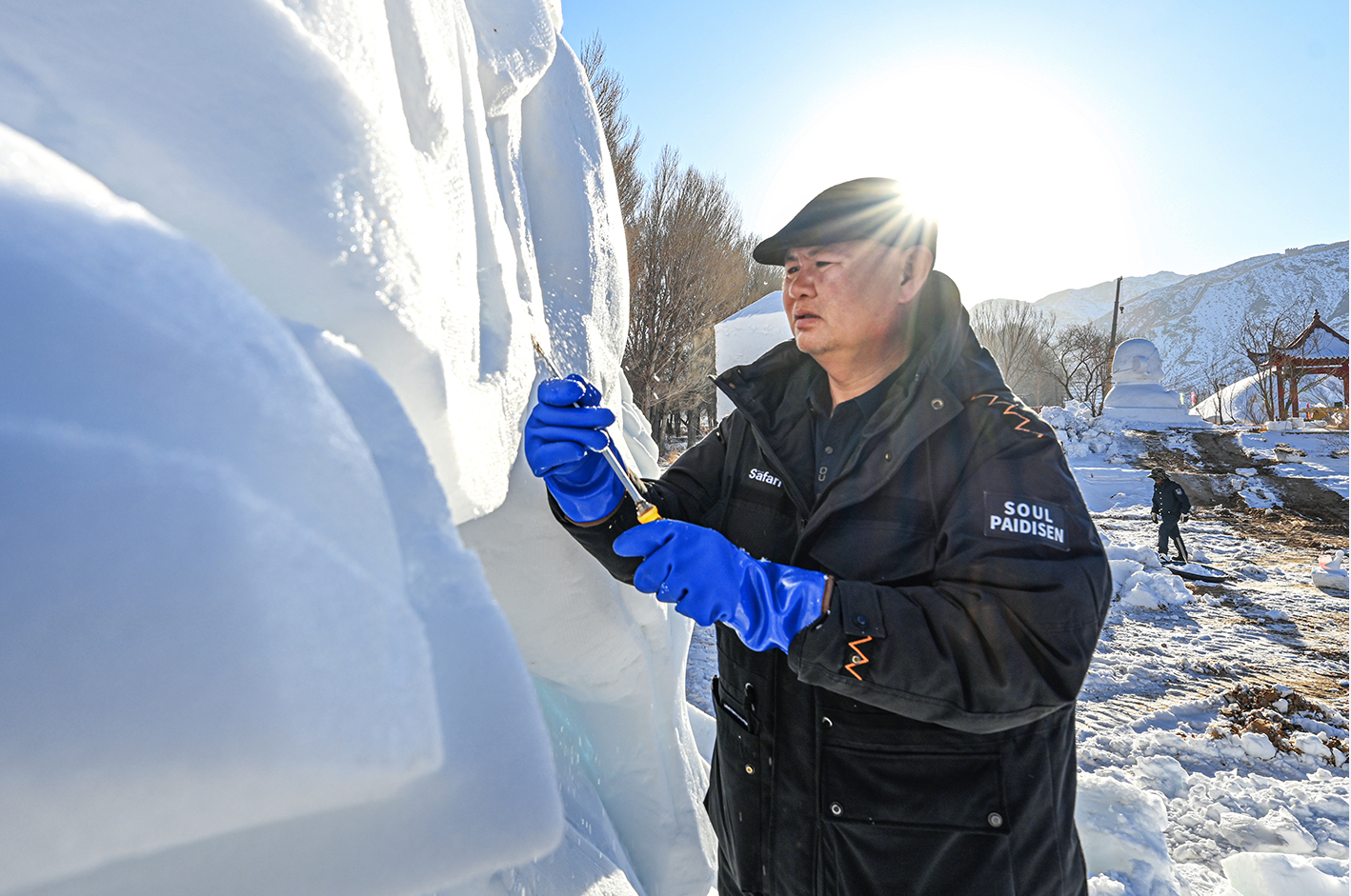 中國甘肅網1月13日訊 據嘉峪關日報報道(融媒體中心記者 李巍 攝)揚鏟塑造型,落刀雕精彩。1月10日,懸壁長城腳下,《昭君出塞》《九尾靈狐》《喜財神》等雪雕作品,在匠人們的精雕細琢中漸漸揭開“面紗”。