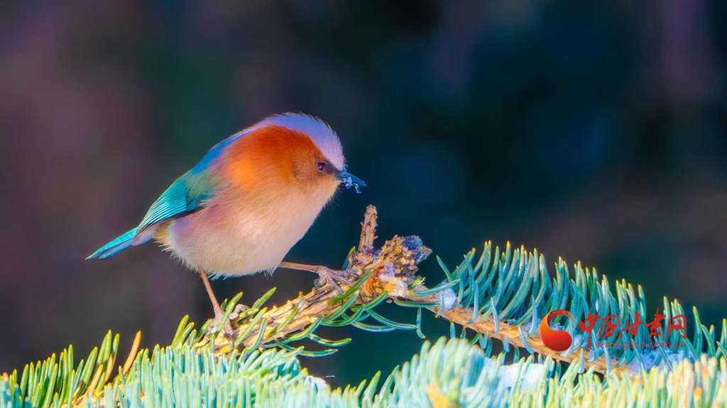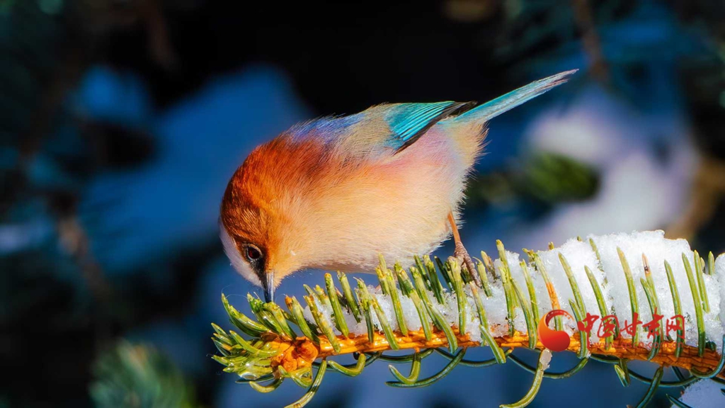 這群被譽(yù)為“祁連山精靈”的小鳥,頭頂雪白羽冠蓬松如絨,仿佛戴上了一頂天然的小絨帽,棕紅面頰溫潤似玉,在陽光下泛著柔和的光澤,藍(lán)綠背羽如同上好的寶石,在雪色映襯下泛著金屬般的質(zhì)感。淡粉與橙白相間的腹羽柔和雅致,層次分明,在純白背景的映襯下,形成強(qiáng)烈而和諧的視覺碰撞,它們或亭亭立于覆雪松枝,或靈巧穿梭于松針間隙,更有靈動的個體俯身探喙,啄取松針縫隙里的昆蟲,一聲輕脆的啄擊,劃破林間的清寂,卻更顯山野幽靜,羽翼輕振間,將“雪中覓食”的鮮活圖景永久定格。