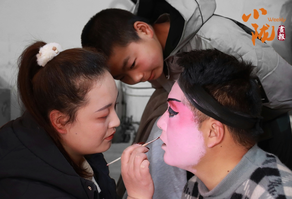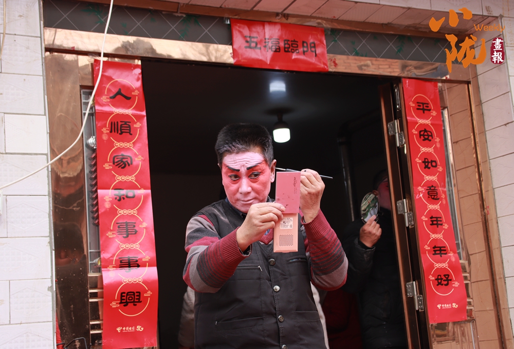 貼著紅春聯(lián)的屋門(mén)口,一位畫(huà)著戲曲臉譜的演員正對(duì)著手機(jī)調(diào)整妝容。這充滿(mǎn)鄉(xiāng)土氣息的戲曲準(zhǔn)備場(chǎng)景,滿(mǎn)是民間年俗里熱鬧又質(zhì)樸的煙火氣,也藏著傳統(tǒng)藝術(shù)在鄉(xiāng)土間的鮮活傳承。