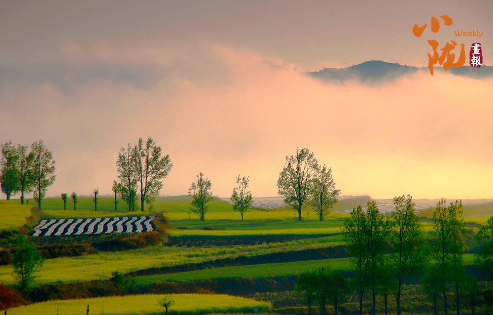 晨霧為華亭的春景蒙上柔紗,遠(yuǎn)山在霞光里若隱若現(xiàn)。層層梯田鋪展著嫩綠與明黃,田壟間覆著的條紋地膜泛著細(xì)光,疏朗的樹(shù)木錯(cuò)落點(diǎn)綴,一派朦朧又鮮活的春野意趣。